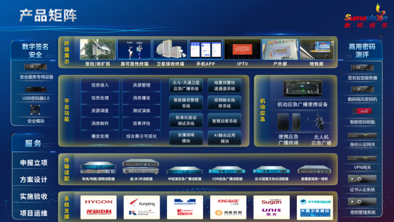 在應急廣播場景下,數(shù)碼視訊能夠提供基于直播衛(wèi)星的端到端解決方案,有效實現(xiàn)應急信息的無死角快速傳輸覆蓋。公司打造了功能全面、運行穩(wěn)定、形態(tài)多樣的產(chǎn)品矩陣,包括歷經(jīng)數(shù)百項目,多年長久穩(wěn)定運行考驗的平臺軟件、能夠穩(wěn)定運行十萬小時的廣電安播級的適配器、采用自研國密標準安全模塊的安全終端,也有為探索新應用、新場景而開發(fā)的新設備,不斷拓展應急廣播的覆蓋方式與應用領域。以直播星應急廣播專用終端為例,設備可按照應急廣播規(guī)范,完成數(shù)據(jù)接收、解密、解碼,并以音頻、圖片、字幕的形式輸出給外部播放。且該終端支持通過串口、網(wǎng)口與外部設備通訊,并傳送應急廣播消息及數(shù)據(jù)給外部設備使用。經(jīng)過多年的科研和項目實踐,數(shù)碼視訊已經(jīng)形成了安全可靠、反應靈敏、平戰(zhàn)結合、上下聯(lián)動的應急廣播整體解決方案和一站式服務體系,能夠幫助客戶建設完整的科學、精細、智能化的應急廣播系統(tǒng)。