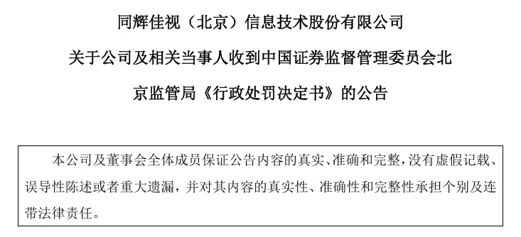 導讀: 文 梧桐小新近日 同輝佳視 北京 信息技術股份有限公司 同輝信息 430090 披露關于公司及相關當事人收到中國證券監(jiān)督管理委員會北京監(jiān)管局《行政處罰決定書》的公告 因公司2018年至2021年期間通...