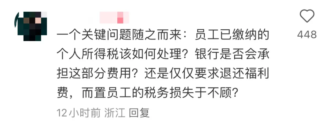 還有人提出疑慮:“一個(gè)關(guān)鍵問(wèn)題隨之而來(lái):員工已繳納的個(gè)人所得稅該如何處理?銀行是否會(huì)承擔(dān)這部分費(fèi)用?還是僅僅要求退還福利費(fèi),而置員工的稅務(wù)損失于不顧?”