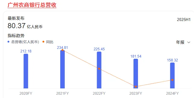 具體看,廣州農(nóng)商行此前已經(jīng)連續(xù)三年?duì)I收下滑。2021年-2024年,該行營(yíng)業(yè)收入分別為234.81億元、225.45億元、181.5億元、158.32億元,三年降了33%。今年上半年,廣州農(nóng)商行勉強(qiáng)止住下跌頹勢(shì),實(shí)現(xiàn)營(yíng)業(yè)收入80.37億元,同比個(gè)位數(shù)增長(zhǎng)9.41%,但全年能否保持增長(zhǎng)仍是未知數(shù)。