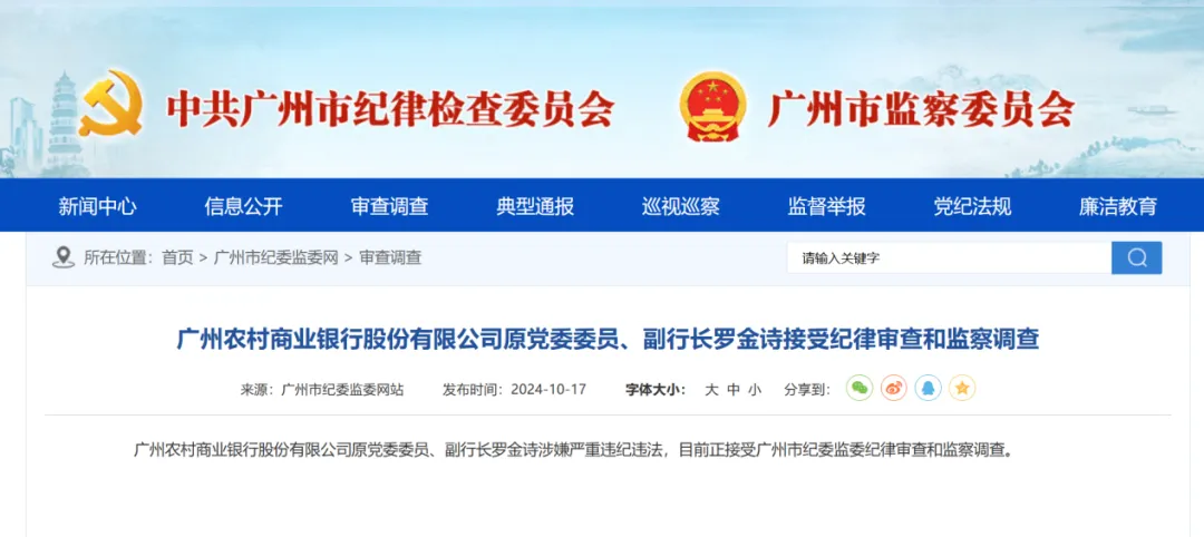 其實(shí),廣州農(nóng)商行近年幾乎每一任主要領(lǐng)導(dǎo)都未能善終。去年10月,廣州農(nóng)商行原黨委委員、副行長(zhǎng)羅金詩(shī),涉嫌嚴(yán)重違紀(jì)違法,受到紀(jì)律審查和監(jiān)察調(diào)查。他在廣州農(nóng)商行出任副行長(zhǎng)六年時(shí)間,2016年辭職,離開(kāi)八年后沒(méi)能逃脫被查的命運(yùn)。