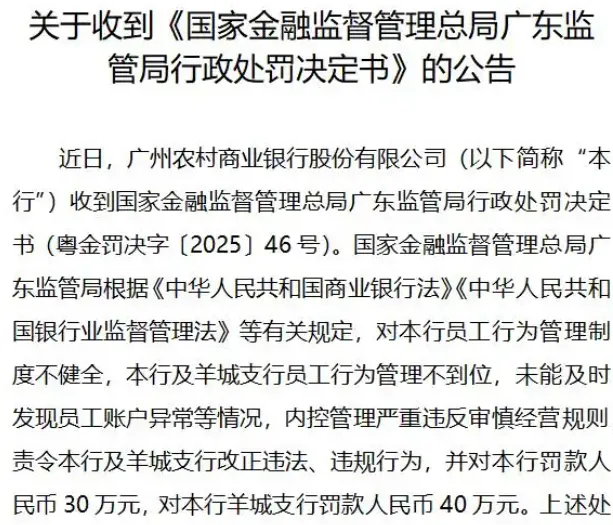2025年5月,該行總行因未及時(shí)發(fā)現(xiàn)員工賬戶(hù)異常被罰30萬(wàn)元;同月,從化支行因現(xiàn)金管理及員工行為管理不到位被罰70萬(wàn)元。