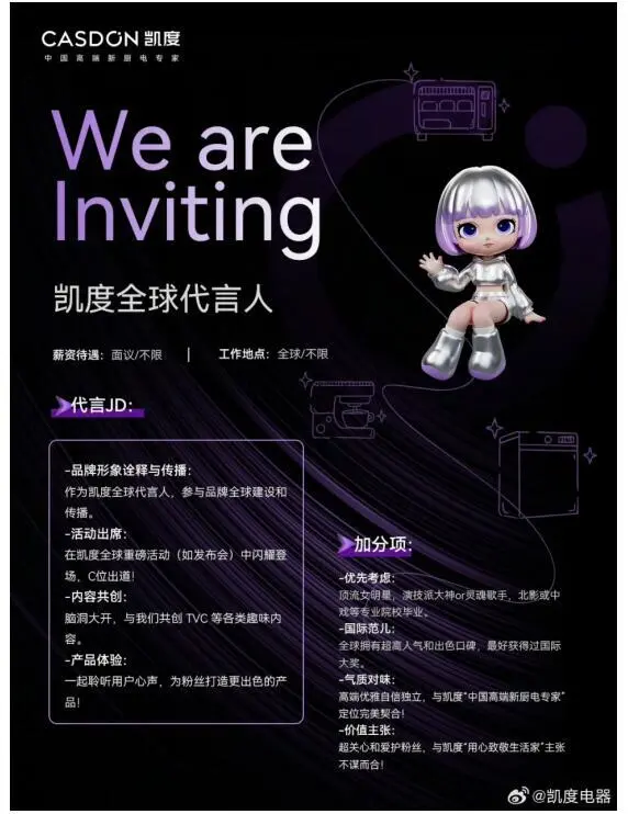 基于這場非同凡響的攜手合作,凱度電器此次官宣代言的方式也不同于以往。從全網(wǎng)公開招聘“頂流女明星”擔任全球代言人,到全民解碼招聘關(guān)鍵詞、猜測謎底,再到正式官宣楊冪,這場獨有的“官宣儀式”在獵聘、BOSS直聘等專業(yè)平臺和微博等社交媒體平臺引發(fā)熱議。
