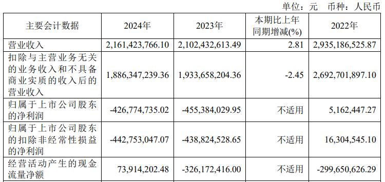 2024年,公司實現(xiàn)營業(yè)收入21.61億元,同比增長2.81%;歸屬于上市公司股東的凈利潤-4.27億元,上年同期為-4.55億元;歸屬于上市公司股東的扣非凈利潤-4.43億元,上年同期為-4.39億元;經(jīng)營活動產(chǎn)生的現(xiàn)金流量凈額7391.42萬元,上年同期為-3.26億元。