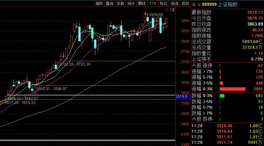 今上午大盤高開7點3870點,探底3868點,沖高3913點,午前收3910點。上證50、滬深300、上證指數(shù),深成指、創(chuàng)業(yè)板、科創(chuàng)板、中證500、中證1000漲1.20%、1.53%、1.20%、1.97%、2.92%、2.13%、1.56%、1.43%。個股漲跌比為4596:747,漲跌停比80:2。兩市半日成交額為1.15萬億,較上個交易日縮量115億。