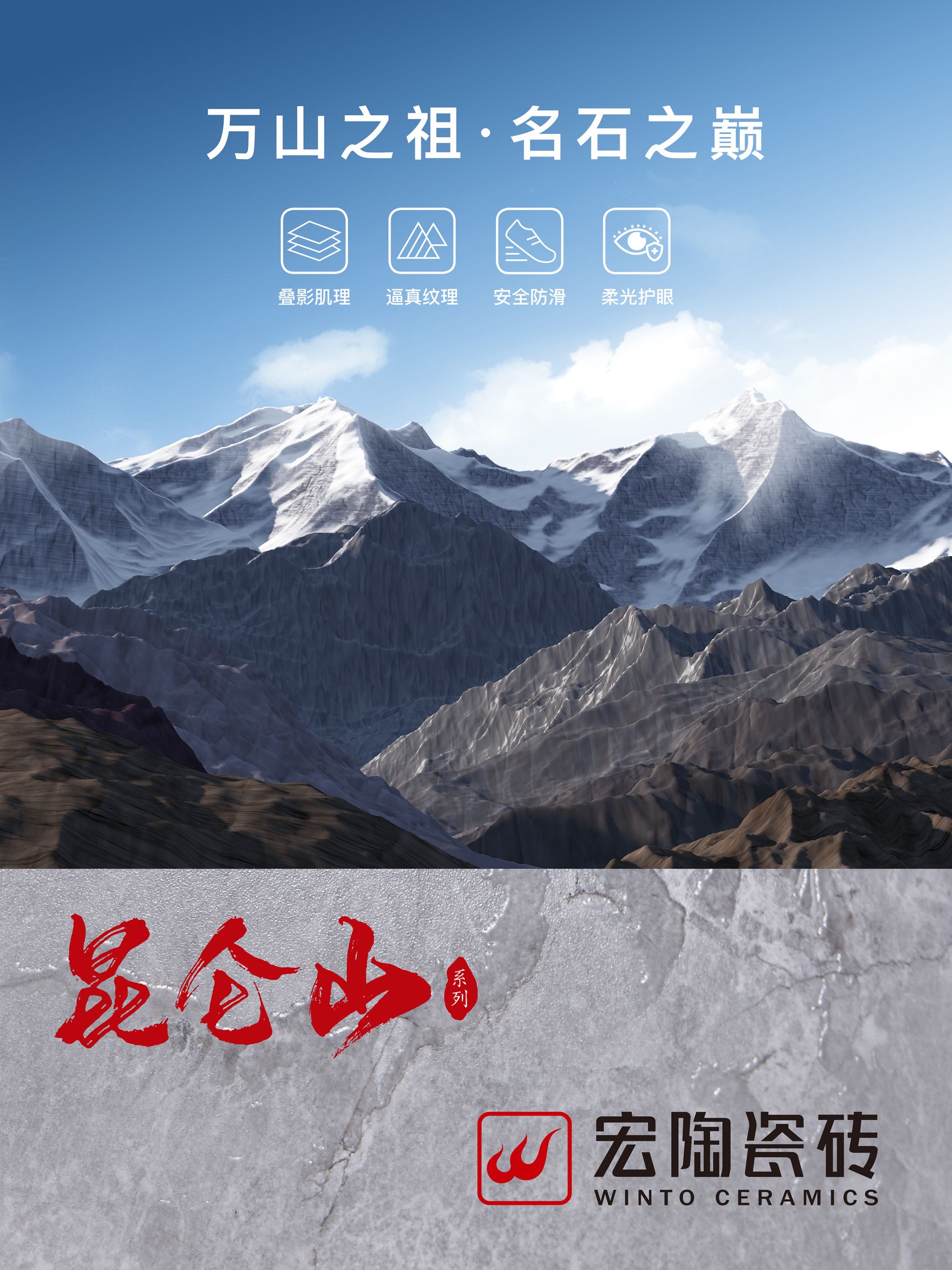如果說卓越品質(zhì)是「昆侖山」系列的堅(jiān)實(shí)骨骼,那么前沿設(shè)計(jì)與先進(jìn)工藝便是其動(dòng)人靈魂。昆侖山系列的設(shè)計(jì)靈感源自“萬山之祖”昆侖山的雄偉與神秘,通過現(xiàn)代陶瓷工藝將自然之美凝結(jié)于瓷磚之上。