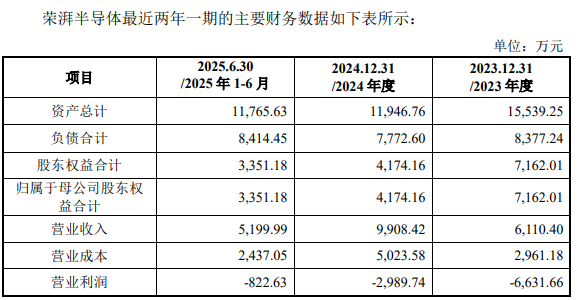 2023年度、2024年度、2025年上半年,榮湃半導體營業(yè)收入分別為6,110.40萬元、9,908.42萬元、5,199.99萬元,凈利潤/歸屬于母公司股東的凈利潤分別為-6,631.96萬元、-2,989.74萬元、-822.99萬元。
