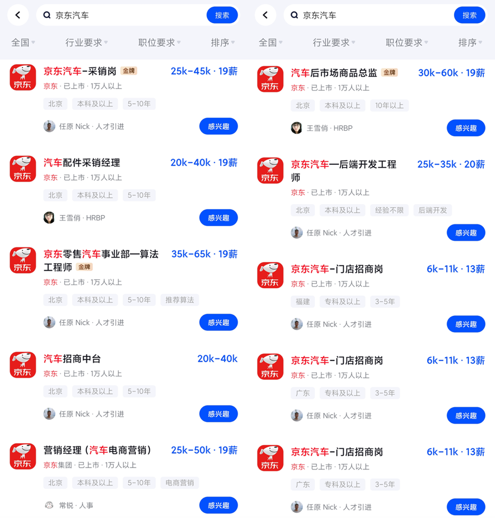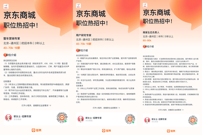 在新車信息密集曝光的同時,記者注意到,京東汽車近期在人才招募上也有大動作。多個招聘平臺信息顯示,京東汽車已釋放多個高薪崗位,部分崗位年薪突破百萬元:汽車零售事業(yè)部算法工程師崗位年薪最高可達123萬元(35k-65k·19薪),汽車后市場商品總監(jiān)崗位年薪最高可達114萬(30k-60k·19薪),汽車行業(yè)采銷負責人年薪最高可達112萬(45k-70k·16薪),整車營銷專家與用戶研究專家年薪最高可達133萬(40k-70k·19薪),商家生態(tài)負責人年薪最高也可突破百萬(60k-90k)。知情人士分析,此舉或為“國民好車”上市及后續(xù)用戶運營、供應(yīng)鏈管理儲備核心力量。