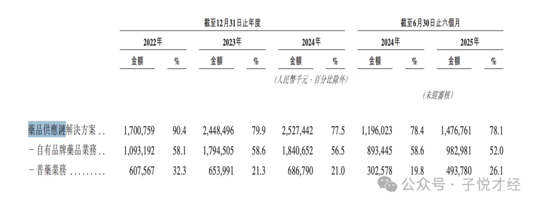 藥品供應(yīng)鏈業(yè)務(wù)占比78%以上,但普藥毛利率僅0.6%-2.3%,幾乎無利可圖。