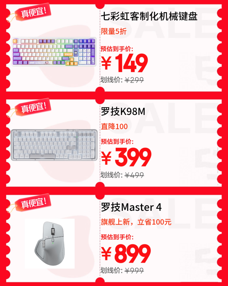 對(duì)于專注案頭工作的用戶而言,鍵盤、鼠標(biāo)等基礎(chǔ)外設(shè)升級(jí)正當(dāng)時(shí)。若偏愛(ài)個(gè)性化與手感,七彩虹青羽98三模機(jī)械鍵盤日常價(jià)299元,限量5折后僅需149元,霜華配色搭配星霜凝軸,兼顧辦公與輕度游戲的舒適輸入;羅技ALTO KEYS K98M琥珀系列無(wú)線鍵盤直降百元,優(yōu)惠到手價(jià)399元,大理石軸與熱插拔設(shè)計(jì)適配多元需求。羅技大師系列MX Master 4高性能無(wú)線藍(lán)牙鼠標(biāo)旗艦上新,立省100元后到手899元,靜音設(shè)計(jì)與無(wú)線接收器配置,為高頻辦公提供更流暢的操控體驗(yàn)。
