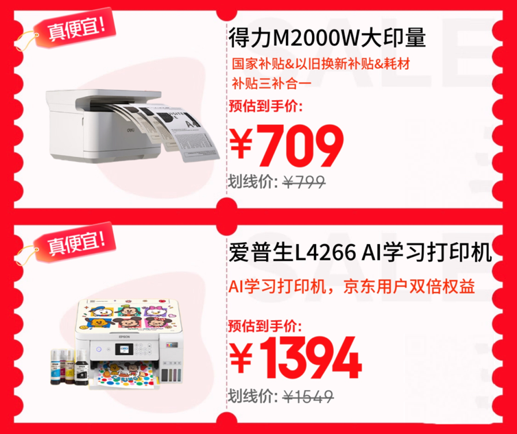 打印場(chǎng)景中,得力M2000W三合一激光打印機(jī)疊加國(guó)家補(bǔ)貼、以舊換新等多重優(yōu)惠,到手709元,4500頁(yè)長(zhǎng)效印量與手機(jī)無(wú)線連接功能,輕松應(yīng)對(duì)家庭作業(yè)打印與辦公文件處理。愛(ài)普生L4266 AI學(xué)習(xí)打印機(jī),京東11.11到手1394元,支持自動(dòng)雙面與AI學(xué)習(xí)打印功能,讓辦公輸出更省心。