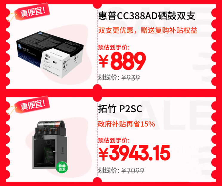 針對(duì)持續(xù)輸出的打印需求,耗材選擇同樣關(guān)鍵?;萜誄C388AD原裝雙支黑色硒鼓適配多款主流打印機(jī),雙支裝更優(yōu)惠且贈(zèng)送復(fù)購(gòu)補(bǔ)貼權(quán)益,京東11.11到手價(jià)889元,可滿足長(zhǎng)期打印需求,減少頻繁更換的麻煩。熱愛(ài)創(chuàng)意設(shè)計(jì)的用戶,拓竹P2SC 3D打印機(jī)可享政府補(bǔ)貼省15%,到手3943元起,大尺寸FDM打印、高精度高速與AI監(jiān)測(cè)烘干功能,為桌面立體創(chuàng)作提供專業(yè)工具。