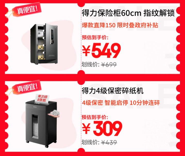 文件管理方面,得力AE66-ZM保險(xiǎn)柜爆款直降150元,京東11.11疊加政府補(bǔ)貼后549元即可入手,指紋密碼等4種解鎖方式與可入墻設(shè)計(jì),為重要資料提供安心守護(hù);得力GA311碎紙機(jī)京東11.11優(yōu)惠價(jià)309元,帶來(lái)4級(jí)保密、單次8張碎紙與智能啟停功能,敏感文件處理更放心。