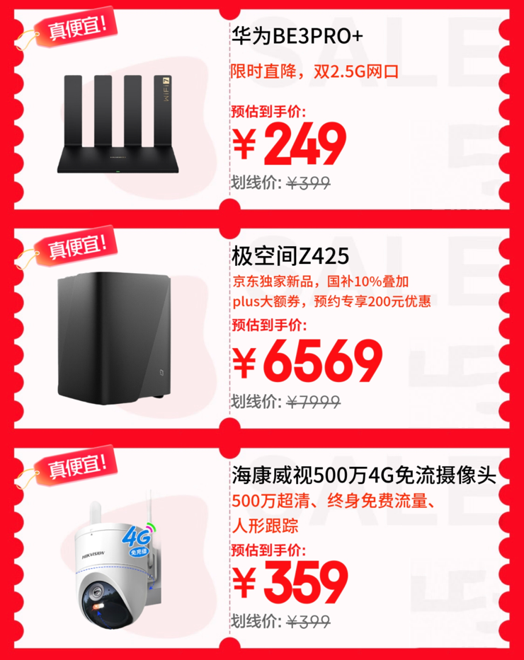 若需搭建家庭或小型團(tuán)隊(duì)的智能中樞,極空間Z425私有云旗艦版值得關(guān)注,作為14核14線程四盤位NAS,搭載萬(wàn)兆網(wǎng)口與專屬UPS,京東下單可疊加國(guó)補(bǔ)10%優(yōu)惠與PLUS會(huì)員大額券,預(yù)約專享200元優(yōu)惠后到手6569元,為多設(shè)備文件存儲(chǔ)與AI協(xié)作提供可靠支持。華為路由BE3 Pro+則以WiFi7+雙2.5G網(wǎng)口與智能天線設(shè)計(jì),限時(shí)直降后249元即可升級(jí)家庭網(wǎng)絡(luò)。??低昋3P5M 4G攝像頭憑借終身免流量、500萬(wàn)像素與360度全景監(jiān)控功能,成為安全防護(hù)的優(yōu)選,京東11.11優(yōu)惠到手價(jià)359元。