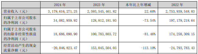 2024年,億道信息實(shí)現(xiàn)營(yíng)業(yè)收入31.80億元,同比增長(zhǎng)22.60%;歸屬于上市公司股東的凈利潤(rùn)為3408.30萬元,同比下降73.54%;歸屬于上市公司股東的扣除非經(jīng)常性損益的凈利潤(rùn)為1868.61萬元,同比下降81.46%;經(jīng)營(yíng)活動(dòng)產(chǎn)生的現(xiàn)金流量?jī)纛~為-2004.68萬元,上年同期為1.53億元。