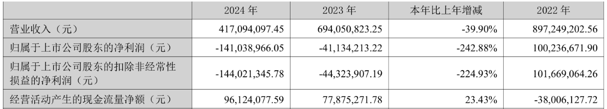 2024年,公司實(shí)現(xiàn)營業(yè)收入4.17億元,同比下降39.90%;歸屬于上市公司股東的凈利潤為-1.41億元,上年同期為-4113.42萬元;歸屬于上市公司股東的扣非凈利潤為-1.44億元,上年同期為-4432.39萬元;經(jīng)營活動(dòng)產(chǎn)生的現(xiàn)金流量凈額為9612.41萬元,同比增長23.43%。