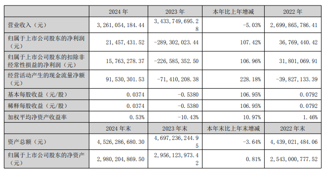 經緯輝開2024年年度報告顯示,公司報告期內營業(yè)總收入為32.61億元,同比下滑5.03%;歸屬于上市公司股東的凈利潤為2145.74萬元;歸屬于上市公司股東的扣除非經常性損益的凈利潤為1576.33萬元;經營活動產生的現金流量凈額為9153.03萬元。