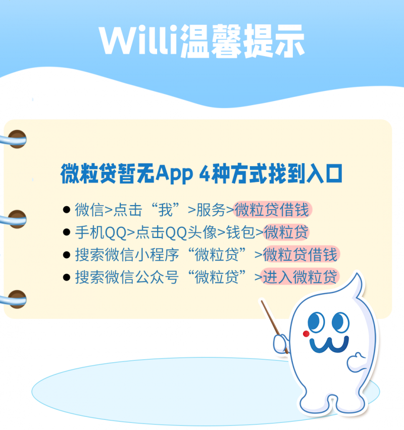 - 微信搜“微粒貸”公眾號 → 點左下角“進入微粒貸”