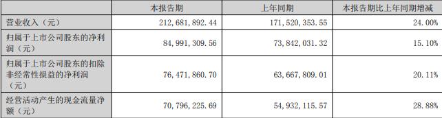 據(jù)公司2025年半年報,報告期內,公司實現(xiàn)營業(yè)收入2.13億元,同比增長24.00%;歸屬于上市公司股東的凈利潤8499.13萬元,同比增長15.10%;扣除非經(jīng)常性損益后的凈利潤7647.19萬元,同比增長20.11%;經(jīng)營活動產(chǎn)生的現(xiàn)金流量凈額7079.62萬元,同比增長28.88%。