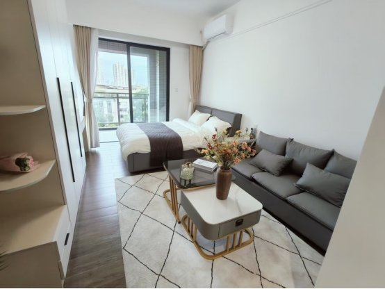 房間內(nèi)配置齊全,獨立廚房配備抽油煙機、冰箱及收納櫥柜,支持簡餐烹飪;五星級床墊、封閉式陽臺、全自動洗衣機與可伸縮晾衣架,兼顧舒適與實用。同時,每戶均設有小型工作學習區(qū),書桌與沙發(fā)合理搭配,適應居家辦公與休閑場景。