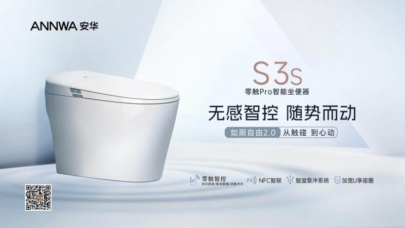 新品S3S零觸Pro智能坐便器,以零觸智控技術讓如廁全程徹底解放雙手;內(nèi)置阻垢過濾水路、凈菌自潔噴槍、抗菌加寬座圈,360°智潔除菌保障衛(wèi)浴健康;簡約流線造型與智能交互界面,彰顯科技美學,為用戶帶來安全、潔凈、便捷的如廁體驗。