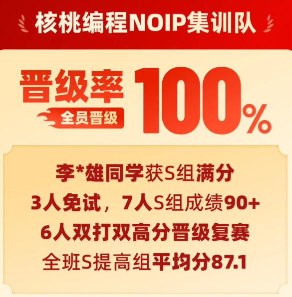 近日,2025 年 CSP-J/S 初賽成績(jī)公布,由核桃編程集訓(xùn)青少年編程學(xué)員 100% 晉級(jí) CSP-J/S復(fù)賽。核桃編程用硬核成績(jī)?cè)忈屃诵艎W培訓(xùn)賽道的領(lǐng)先水準(zhǔn)。