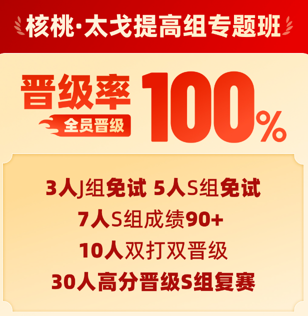 而在核桃?太戈提高組專題班,其學(xué)員延續(xù)強(qiáng)勢(shì)表現(xiàn),3 人獲 J 組免試、5 人獲 S 組免試,7 人 S 組成績(jī)超 90 分,10 人實(shí)現(xiàn) “雙晉級(jí)”,30 人高分晉級(jí) S 組復(fù)賽,成為 S 組晉級(jí)的重要力量。