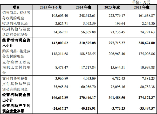 上述同期,道生天合銷售商品、提供勞務(wù)收到的現(xiàn)金分別為161,638.87萬元、223,779.17萬元、248,612.61萬元、105,605.40萬元;經(jīng)營活動產(chǎn)生的現(xiàn)金流量凈額分別為-35,497.57萬元、-3,773.23萬元、40,128.91萬元、-24,617.27萬元。