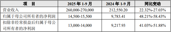 經(jīng)初步統(tǒng)計測算,公司預(yù)計2025年1-9月營業(yè)收入為260,000萬元至270,000萬元,同比增長22.32%至27.03%;歸屬于母公司所有者的凈利潤14,500萬元至15,500萬元,同比增長48.21%至58.43%;扣除非經(jīng)常損益后歸屬于母公司所有者的凈利潤13,000萬元至14,000萬元,同比增長41.03%至51.88%。