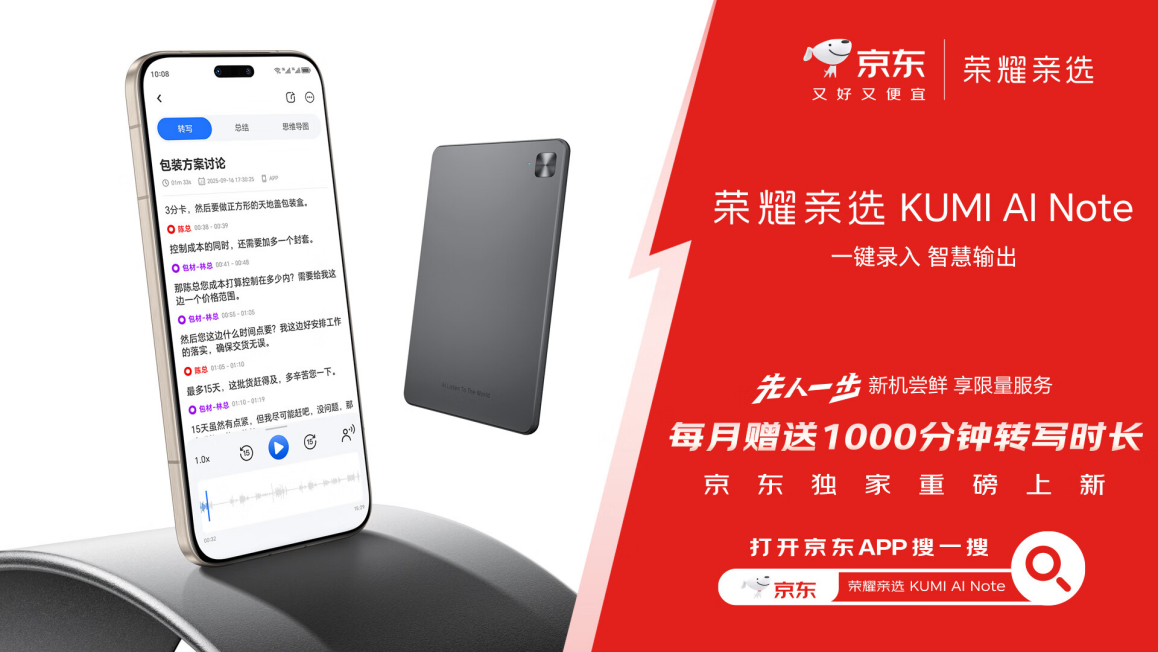 伴隨榮耀平板新品同步開售的,還有榮耀親選KUMI AI Note錄音卡。這款智能配件集一鍵錄音、聲紋識別、多語言轉寫等實用功能于一身,并能智能識別錄音場景,配合長續(xù)航設計與每月1000分鐘轉寫時長贈送,成為學習、采訪、會議與培訓場景的得力助手。即日起,用戶可在京東選購,到手價699元。