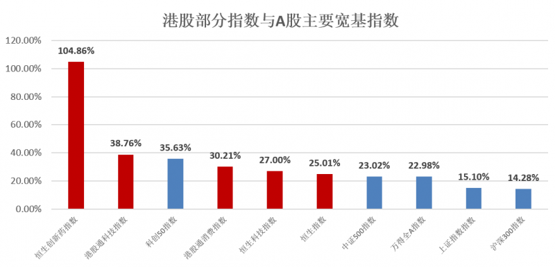 今年以來中國資產(chǎn)重估行情中,港股在新消費(fèi)、科技、創(chuàng)新藥等板塊的作用下整體漲幅更為可觀。