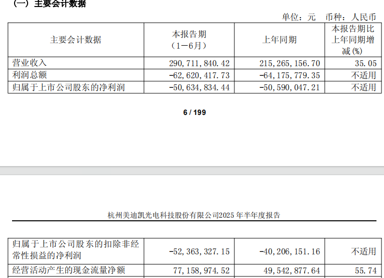 中國經(jīng)濟網(wǎng)北京10月16日訊 美迪凱(688079.SH)日前發(fā)布2025年半年度報告。今年上半年,公司實現(xiàn)營業(yè)收入2.91億元,同比增長35.05%;歸屬于上市公司股東的凈利潤-5063.48萬元;歸屬于上市公司股東的扣除非經(jīng)常性損益的凈利潤-5236.33萬元;經(jīng)營活動產(chǎn)生的現(xiàn)金流量凈額7715.90萬元。