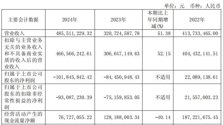 2024年,公司實現(xiàn)營業(yè)收入4.86億元,同比增長51.38%;歸屬于上市公司股東的凈利潤-1.02億元,上年同期為-8445.09萬元;歸屬于上市公司股東的扣除非經(jīng)常性損益的凈利潤-9308.72萬元,上年同期為-7515.99萬元;經(jīng)營活動產(chǎn)生的現(xiàn)金流量凈額7672.71萬元,同比減少40.14%。
