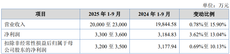 公司預(yù)計(jì)2025年1-9月的營(yíng)業(yè)收入為20,000萬(wàn)元至23,000萬(wàn)元,變動(dòng)比例0.78%至15.90%;凈利潤(rùn)為3,300萬(wàn)元至3,600萬(wàn)元,變動(dòng)比例3.62%至13.04%;扣除非經(jīng)常性損益后歸屬于母公司股東的凈利潤(rùn)為3,200萬(wàn)元至3,500萬(wàn)元,變動(dòng)比例0.69%至10.13%。
