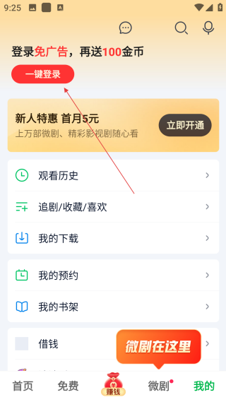 2、在個(gè)人中心,點(diǎn)擊【一鍵登錄】選項(xiàng),觸發(fā)登錄可免廣告追劇的彈窗界面。