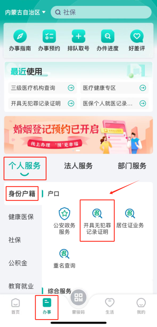 2.找到“個人服務(wù)-身份戶籍”板塊下的“開具無犯罪記錄證明”,點擊即可進入;