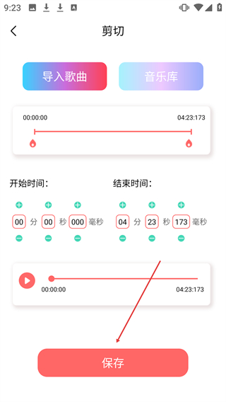4、在音頻剪切設(shè)置頁面調(diào)整時間后點擊【保存】按鈕,完成剪切操作。