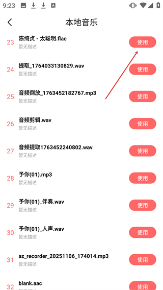 3、在本地音樂頁面點擊目標(biāo)音頻對應(yīng)的【使用】按鈕,進入音頻剪切設(shè)置頁面。