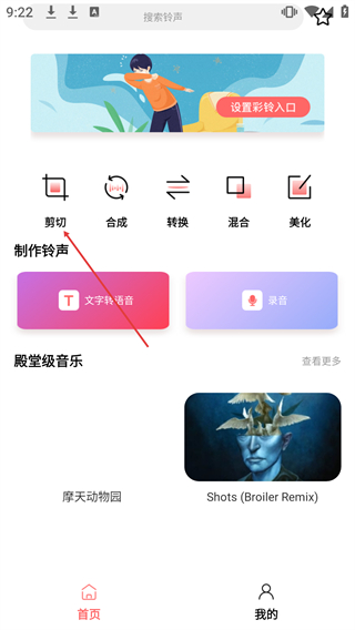 1、在鈴聲制作應(yīng)用首頁點擊【剪切】選項,進入剪切頁面。