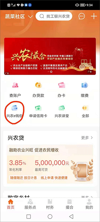 1、進(jìn)入首頁(yè)中點(diǎn)擊“興農(nóng)e錢(qián)包”;