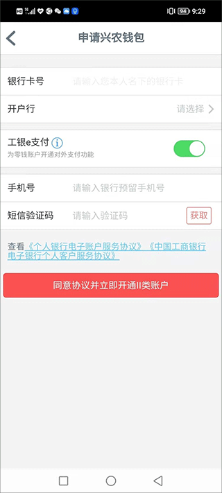 4、輸入銀行卡號(hào),然后輸入手機(jī)號(hào)獲取驗(yàn)證碼,點(diǎn)擊下方“同意協(xié)議并立即開(kāi)通二類(lèi)賬戶(hù)”。