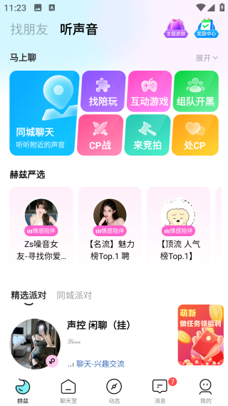 6、在【聽聲音】板塊中,有同城聊天、找陪玩、互動游戲、組隊開黑、CP站、來競拍、處CP等玩法;