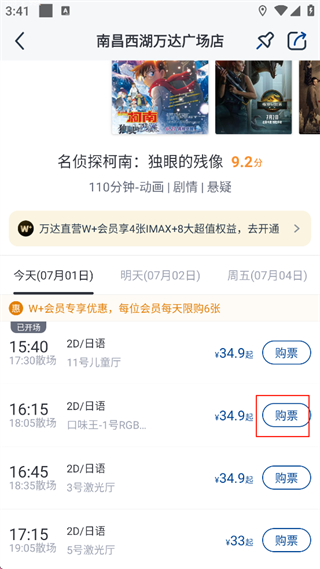 2、找到想要看的電影,選擇日期和時(shí)間之后,點(diǎn)擊購(gòu)票;