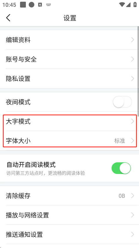 2、在設(shè)置中提供編輯資料、賬號(hào)與安全、隱私設(shè)置、夜間模式、大字模式、字體大小等功能;