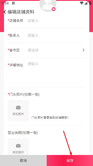 4、在編輯店鋪資料頁面,填寫完整必填信息后點擊底部【保存】按鈕,完成店鋪信息更新。