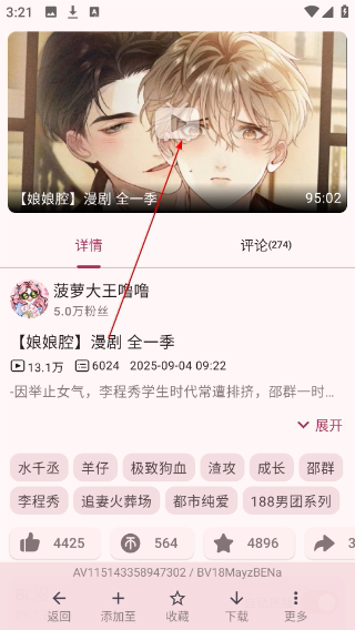 3、在搜索結(jié)果頁,點擊【娘娘腔】漫劇全一季視頻,進入視頻詳情頁。