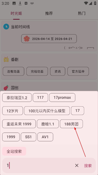 2、在搜索界面,點擊熱門搜索中的【188男團】關(guān)鍵詞,進入相關(guān)搜索結(jié)果頁。