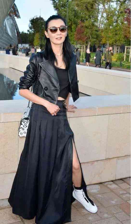 張曼玉本身氣質(zhì)比較清冷,淡顏系長相配上偏中性風(fēng)格的皮夾克外套,更能實現(xiàn)“人衣合一”的穿搭效果。內(nèi)搭黑色露臍裝,強調(diào)腰線位置;下半身搭配黑色分衩裙,融入了更具女人味的單品,強化了整體造型風(fēng)格,又美又颯。