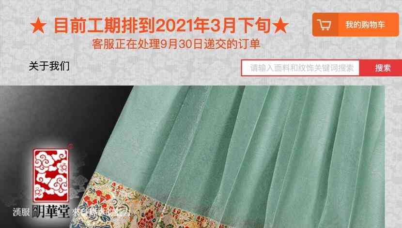 而一些走高端路線的漢服店,定價(jià)甚至能超過一些奢侈品牌。如走高端定制路線的漢服商家明華堂,一條單裙兩三千元,最貴的套裝能達(dá)到萬元以上。這家的衣服在二手市場更能炒出兩三倍的價(jià)格,被漢服愛好者們戲稱為“行走的人民幣”。10月8日,南都記者瀏覽其官網(wǎng)發(fā)現(xiàn),該店工期已經(jīng)排到了2021年的3月下旬。