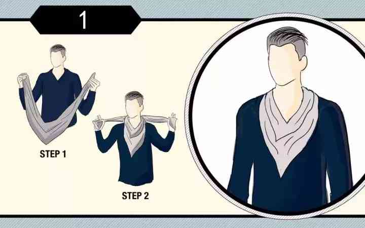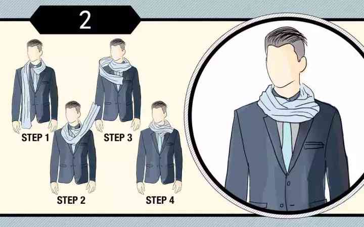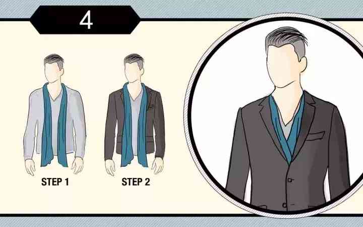 將圍巾兩端先垂在胸前,然后分別把圍巾繞在脖子上,最后將圍巾末端藏在衣服內。
